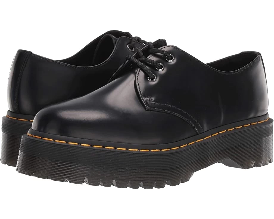 The polished leather upper and commanding platform outsole of the Dr. Martens® 1461 Quad Platform shoes will have you standing out to new heights of styles. SKU: #9465650Let everyone bask in your glow when you step out wearing the stylish Dr. Martens® 1461 Quad Platform oxford shoe! Polished Smooth leather upper is made from the original Dr. Martens super durable leather that has a smooth finish and is polished to a high shine.The premium leather upper has a traditional lace-up closure with tonal metal eyelets for added style and a secure fit.Traditional lace-up style with fabric laces and tonal metal eyelets for added style and a secure fit.Goodyear® welt construction heat seals and sews together the upper and sole for long-lasting durability. Leather and textile lining. Breathable textile lining. Cushioned leather and textile footbed for underfoot support and comfort.Cushioned leather footbed for underfoot support and comfort.Super-chunky 1.5 inch Quad platform sole.Super-chunky Quad platform sole and a rugged commando tread adds a tough, extra-empowering vibe to any look.