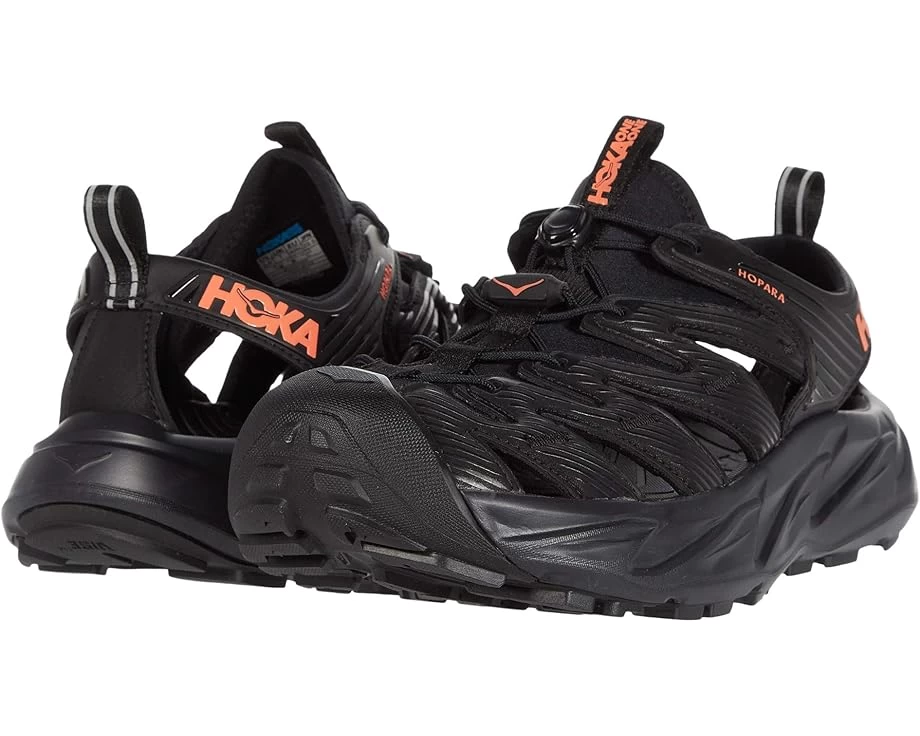 For information on how HOKA ONE ONE contributes to the community, please visit the About page.SKU: #9321295The Hoka One One® Hopara trail and hiking sandals will quickly become a favorite for the true outdoor explorer!Surface: Hiking / Mountain / Trail.Heel-Toe Drop: 5.00mm.Stability: Neutral; allows the foot to adopt its natural placement.Cushioning: Responsive; provides enhanced response, durability, cushioning, and energy return.Synthetic and neoprene upper with strategic cutouts for increased drainage and flexible comfort.Gusseted neoprene collar with pull tabs and a quick-lace system for easy adjustments and a secure fit.Rubberized EVA midsole promotes a more cushioned and responsive ride.Rubberized toe cap for added protection against debris.Sticky rubber outsole provides support and grip in wet or dry conditions.4mm multi-directional lugs with added grooving for better grip when wet.Imported.Product measurements were taken using size 8.5, width B – Medium. Please note that measurements may vary by size.Measurements: